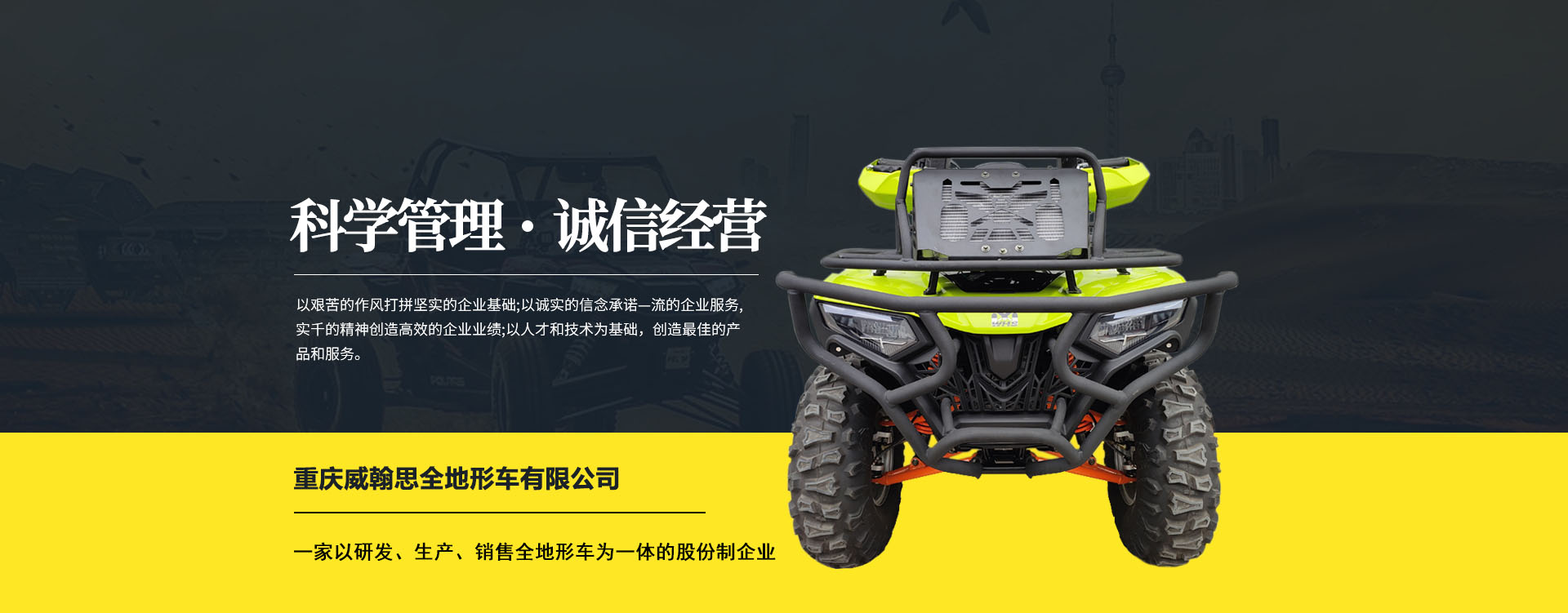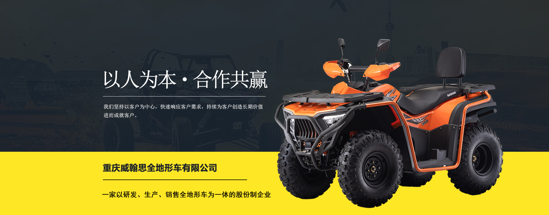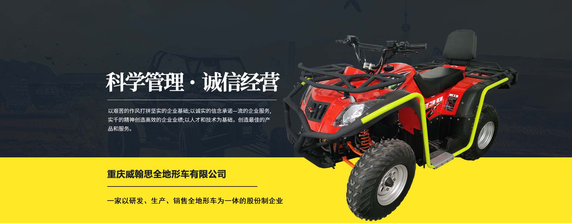 重慶威翰思全地形車有限公司成立于2016年9月,一家以研發(fā)、生產、銷售全地形車為一體的股份制企業(yè)。公司銷售額超過5000萬。現(xiàn)有專業(yè)市場售后服務團隊。公司秉承“敬業(yè)、超越、活力、用戶至上”的企業(yè)精神,“以人為本,合作共贏;”的核心價值觀,“嚴格管理創(chuàng)優(yōu)質、名牌戰(zhàn)略拓市場”的質量方針,使公司一步步邁上新的臺階。公司與重慶航天巴山摩托車制造公司達成戰(zhàn)略合作協(xié)議。共同出資致力于沙灘車旅游市場產品研發(fā),項自運營指導,市場維護等全方位市場拓展。重慶航天巴山摩托車制造公司授權;重慶威翰思全地形車有限公司為中國區(qū)唯─戰(zhàn)略合作伙伴。
