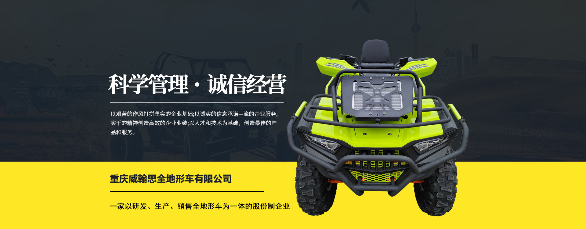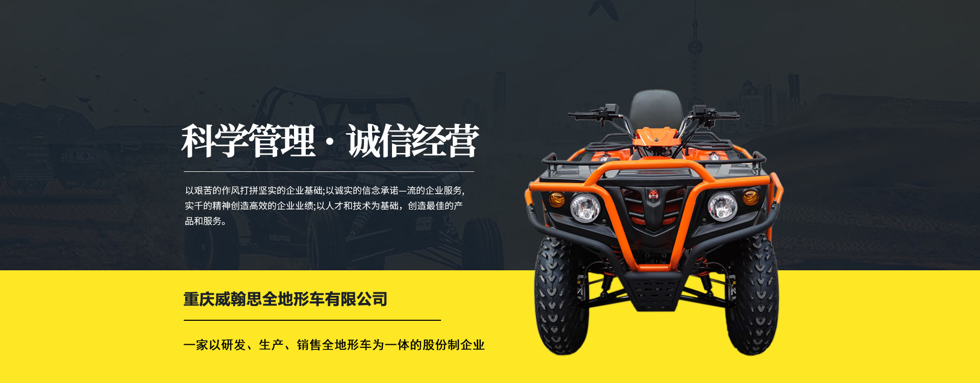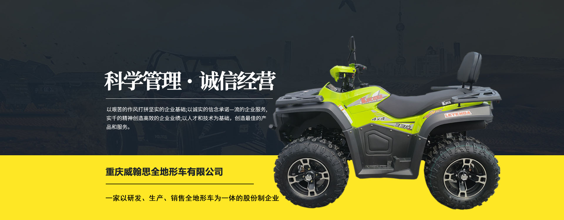 重慶威翰思全地形車有限公司成立于2016年9月,一家以研發(fā)、生產、銷售全地形車為一體的股份制企業(yè)。公司銷售額超過5000萬。現(xiàn)有專業(yè)市場售后服務團隊。公司秉承“敬業(yè)、超越、活力、用戶至上”的企業(yè)精神,“以人為本,合作共贏;”的核心價值觀,“嚴格管理創(chuàng)優(yōu)質、名牌戰(zhàn)略拓市場”的質量方針,使公司一步步邁上新的臺階。公司與重慶航天巴山摩托車制造公司達成戰(zhàn)略合作協(xié)議。共同出資致力于沙灘車旅游市場產品研發(fā),項自運營指導,市場維護等全方位市場拓展。重慶航天巴山摩托車制造公司授權;重慶威翰思全地形車有限公司為中國區(qū)唯─戰(zhàn)略合作伙伴。